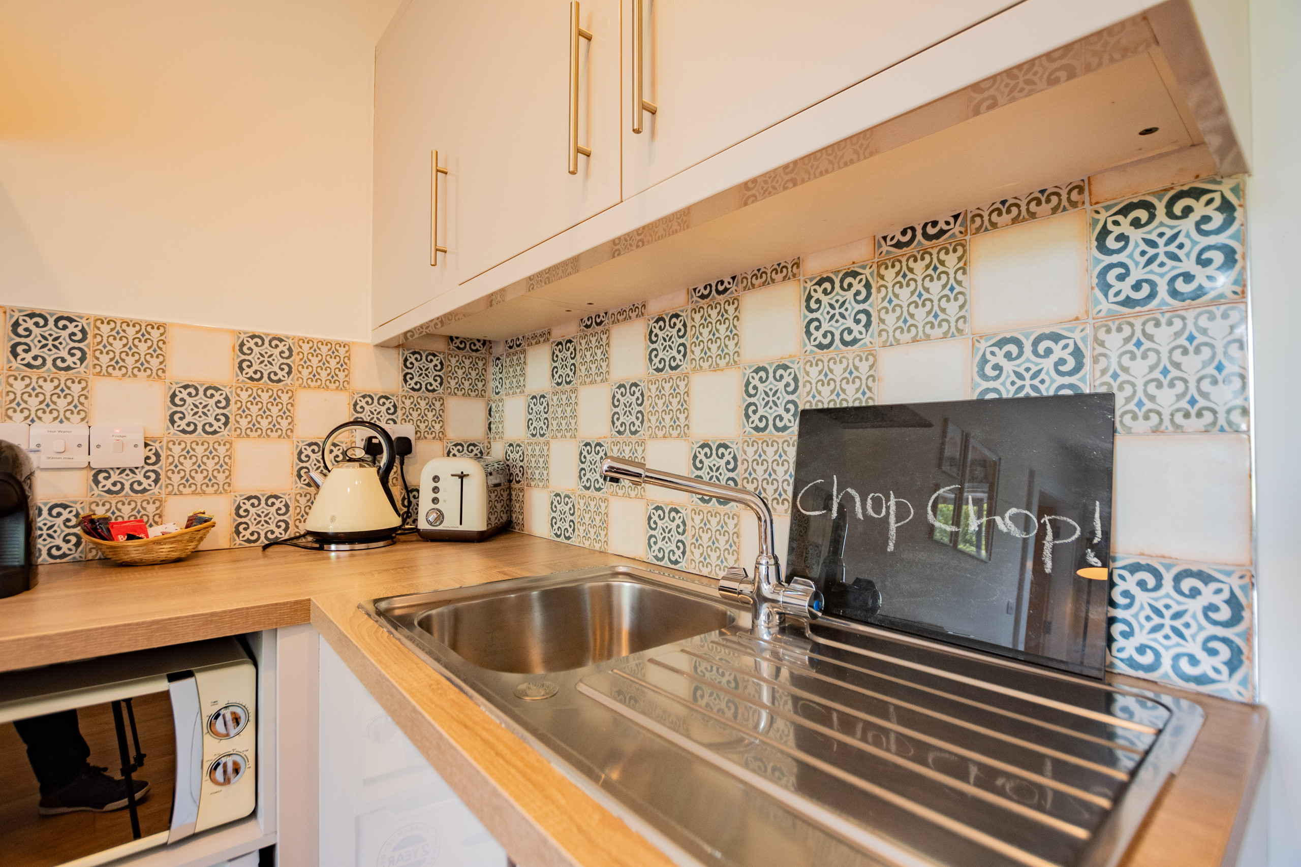 The kitchen, though compact, is fully equipped with all the essentials needed to prepare a delightful breakfast or a light meal. It features a hob, microwave, small fridge, coffee machine, kettle, and toaster. The absence of an oven is hardly noticeable, as the kitchen's efficient design and modern appliances cater to your culinary needs. The pop-up dining area can be easily set up for formal dining and effortlessly stored away to maintain the spacious open-plan feel.