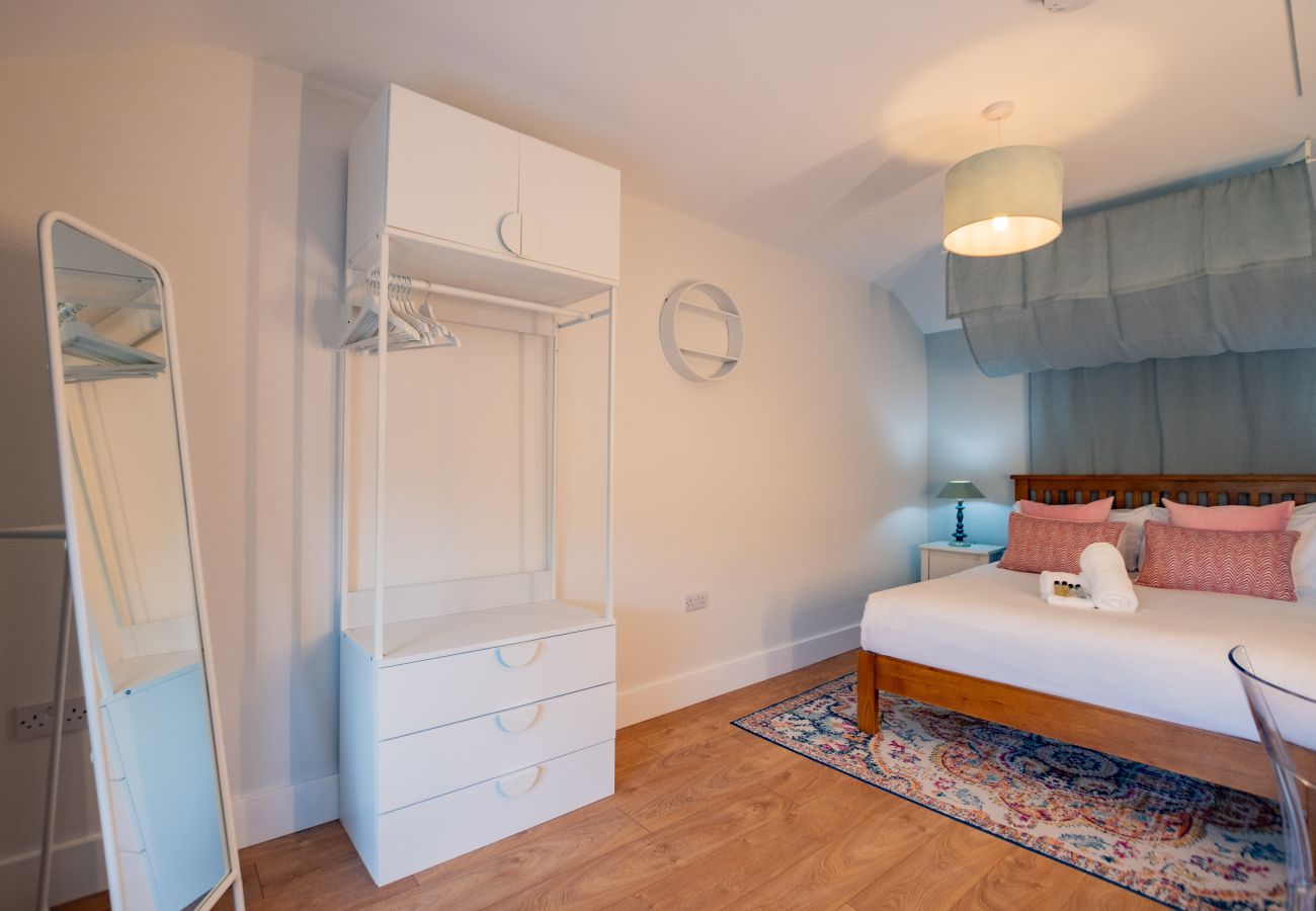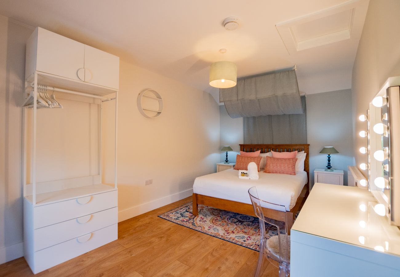 The master bedroom has a 4ft6in bed frame. Make use of the full length mirror, vanity to get yourself ready for your night out. Bedside tables and lamps all make things a little more homely.