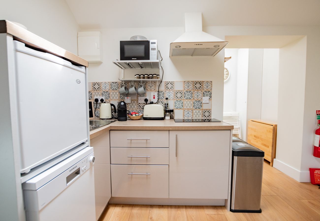 The kitchen is compact but offers all the functionality of a hob, fridge, microwave, and dishwasher. Cutlery, crockery, and basic cooking utensils are supplied.