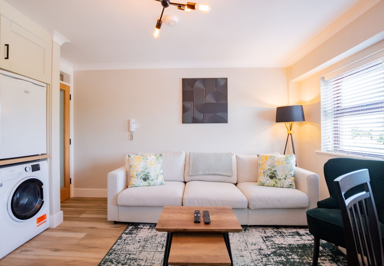 As you step into our apartment, you’ll be greeted by an inviting open-plan living, dining, and kitchen area designed with your comfort in mind. The spacious living area features a large, plush sofa and a cozy armchair, offering the perfect spot to unwind after a day of exploring Galway’s sights. Whether you’re catching up on your favorite shows on the flat-screen TV, reading a book, or simply relaxing with a cup of coffee, this space is tailored for relaxation. Adjacent to the living area is a dining table that comfortably seats four, making it ideal for enjoying meals together or planning your daily itinerary. With its stylish design and ample seating, the dining area doubles as a perfect workspace if you need to catch up on emails or work remotely.