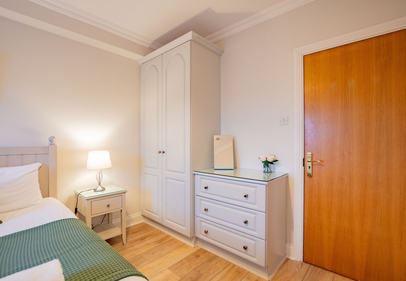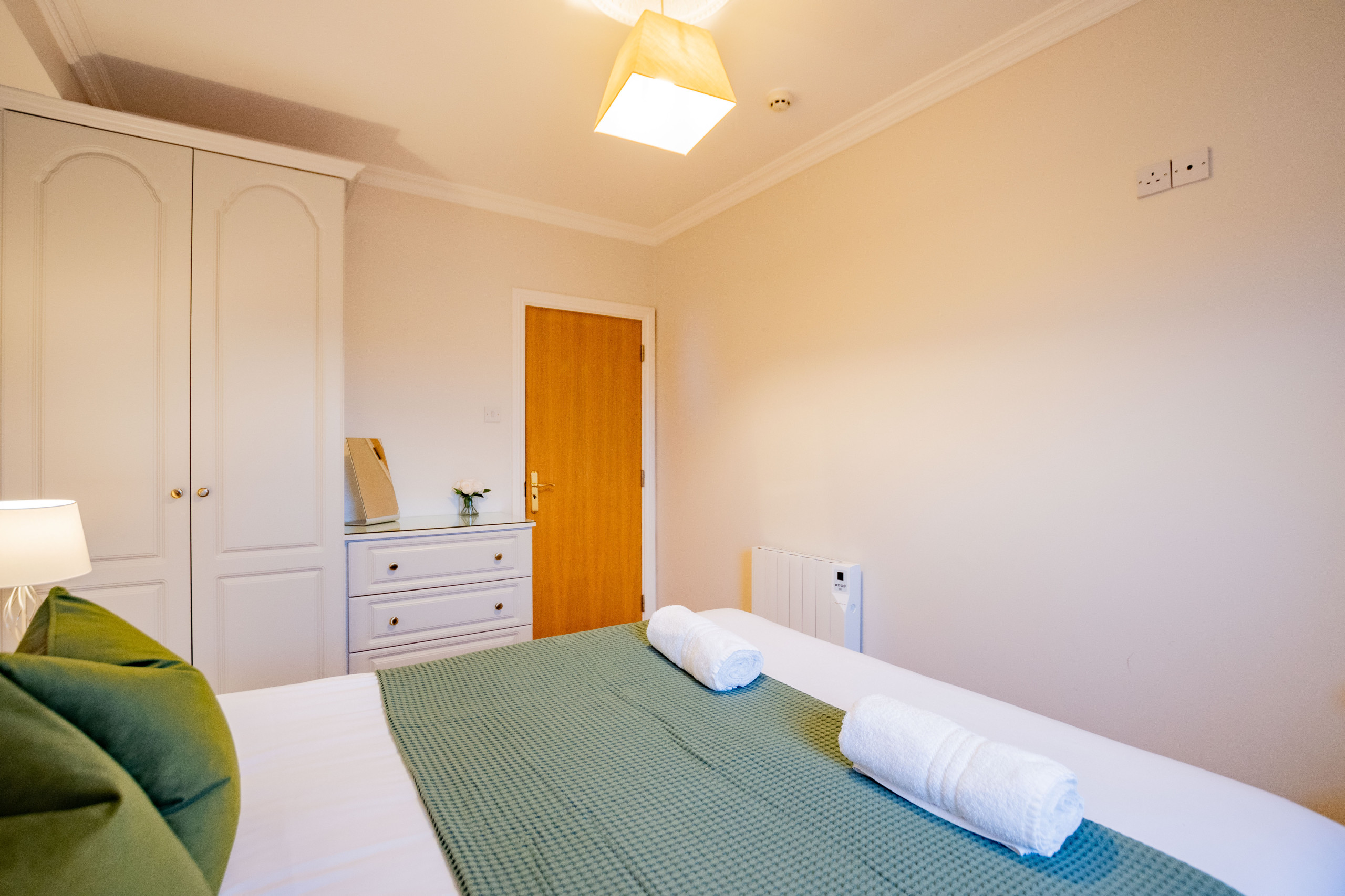 The master bedroom has a 4ft6in bed frame. Make use of the full length mirror, vanity to get yourself ready for your night out. Bedside tables and lamps all make things a little more homely.