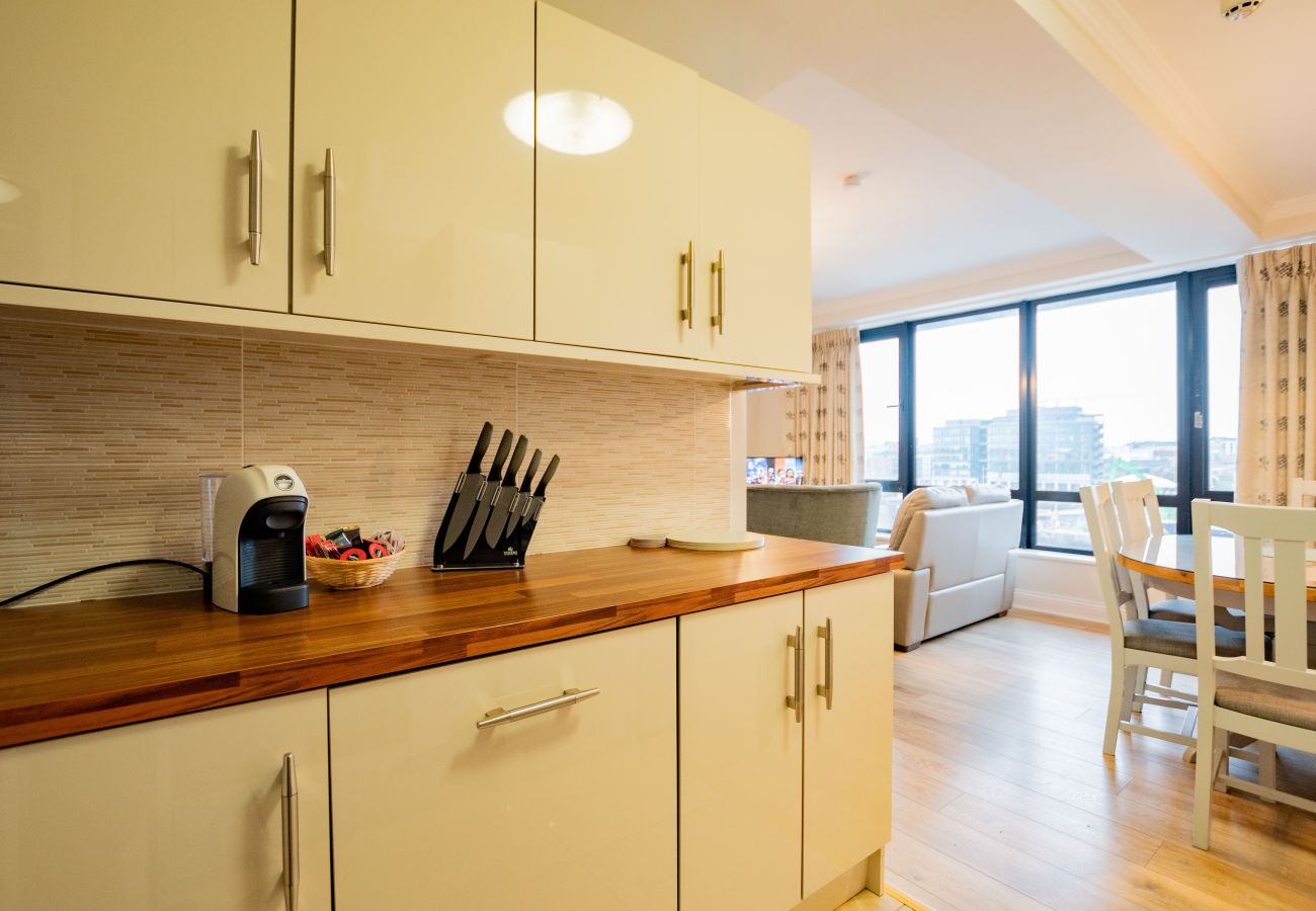Located just a few minutes from the Latin Quarter, Claddagh, and Long Walk you will be sure to have a wonderful stay in this accommodation. The home is located in a private building with private access. Upon entering the penthouse you are greeted with beautiful wood flooring that flows throughout the first floor. The living room has over sized windows allowing fantastic views of the harbour and city. It is open plan to the kitchen and dining area and offer comfortable leathers sofas, and flat screen TV. The kitchen is finished in a cashmere gloss with stylish counter tops and all major modern appliances. The dining table has seating for four,
