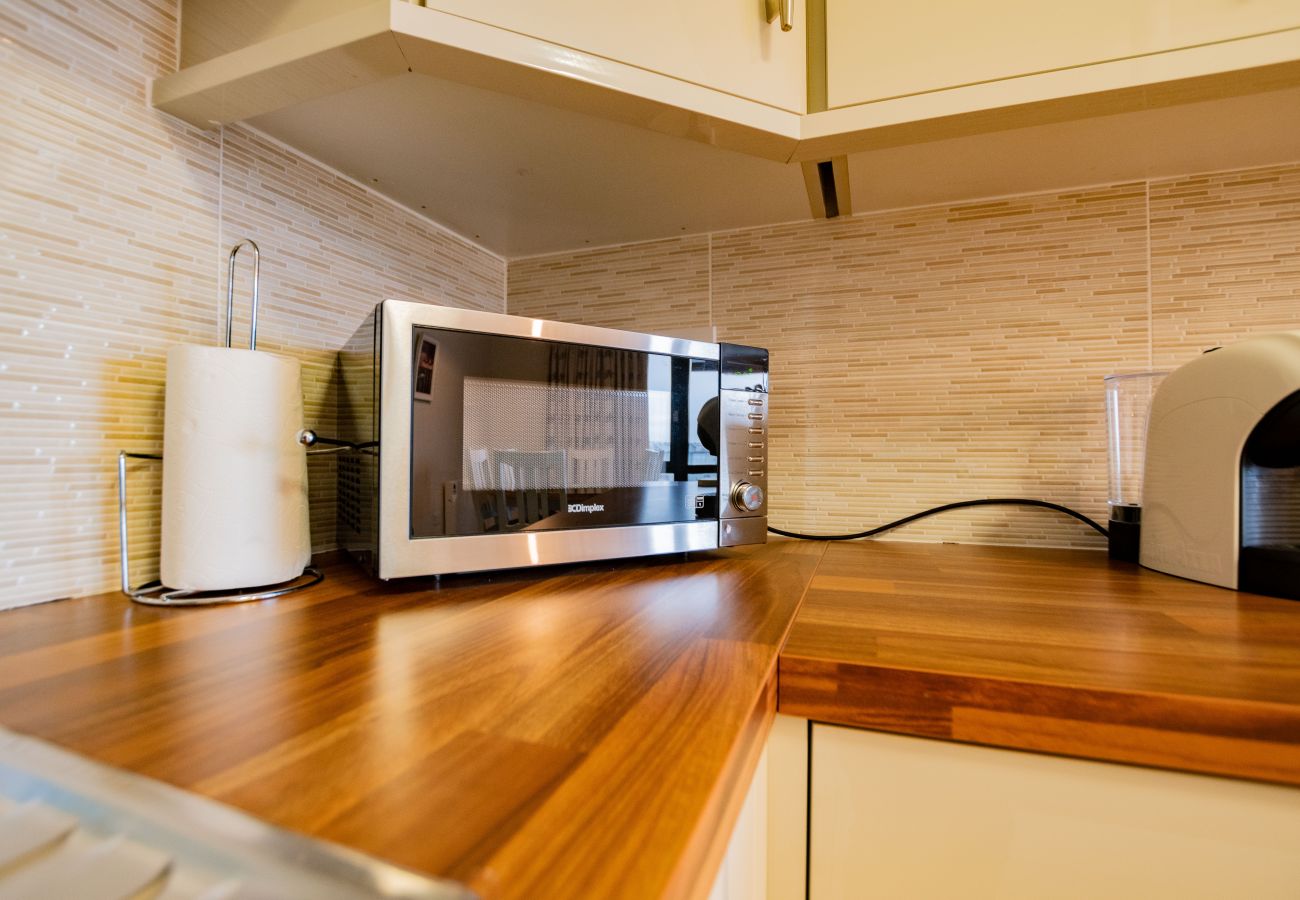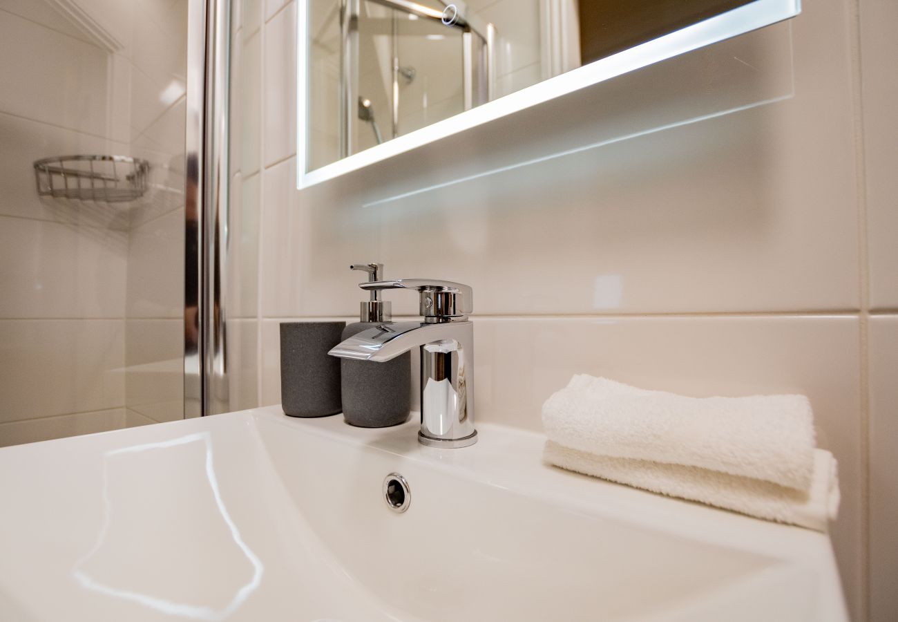 The kitchen is compact but offers all the functionality of a hob, fridge, microwave, and dishwasher. Cutlery, crockery, and basic cooking utensils are supplied.