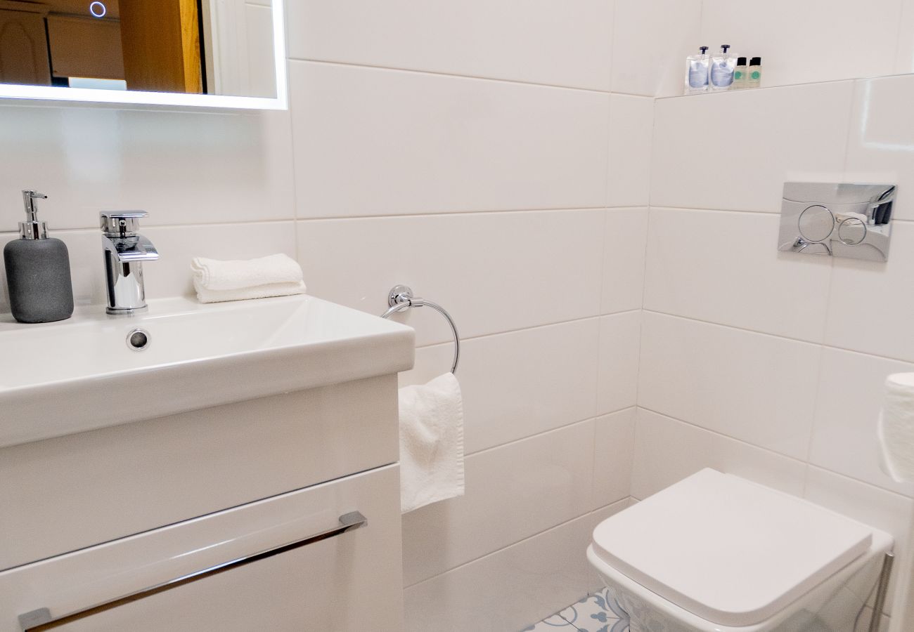 Across the hallway there are two bedrooms. Both offer luxury mattresses in king size (5x6ft), built in wardrobes and views. One of the bedrooms is en suite with walk in shower, wc, and sink. Adjacent the main bathroom with walk in shower, wc, and sink.